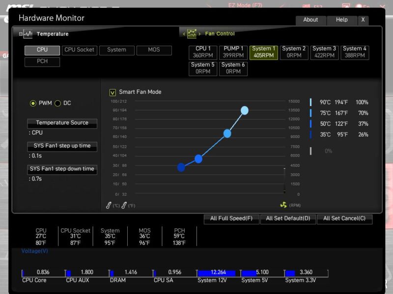 で、BIOS設定の見直しを行ったのだが、どうやらSmart Fan Mordeを選んでPWM制御を選んでいないと、駄目っぽい。
